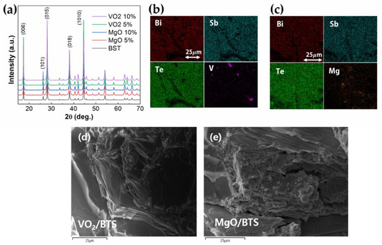 The dispersion of oxide particles is investigated by the energy-dispersive spectroscopy (EDS) elemental map analysis for the samples for MgO 10 mol.%/BST composite (Figure 1b) and VO2 10 mol.%/BST composite (Figure 1c). While Bi, Sb, and Te are homogeneous in compounds, V and Mg are distributed randomly, which shows the phase separation of VO2 and MgO in BST matrix. Figure 1d,e shows the scanning electron microscope (SEM) images of 10 mol.% dispersed VO2/BST and MgO/BST composites. Because the Bi2Te3-based compounds have layered crystal structure with van der Waals bonding layer along the c-axis, it shows the stacking along the c-axis, implying the anisotropic thermoelectric properties. It is generally known that the electronic transport properties are better along the in-plane direction rather than those of the out-of-plane direction, while the thermal conductivity along the out-of-plane direction is lower than that of the in-plane direction. In many cases, the thermoelectric performance along the out-of-plane direction is higher than that of the in-plane direction due to lower thermal conductivity, so we measured thermoelectric properties along the out-of-plane direction.
