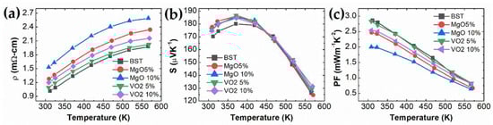 The temperature-dependent electrical resistivity ρ, Seebeck coefficient S, and power factor PF = are shown in Figure 2. The electrical resistivity increases continuously with increasing temperature, indicating a metallic or degenerated semiconducting behavior. The Seebeck coefficient of all samples shows the positive value, consistent with the positive Hall coefficients, showing carriers’ p-type conduction. The electrical resistivity of MgO/VO2 Bi0.5Sb1.5Te3 composites increases with increasing oxide concentration such that the resistivity value of 10 mol.% is larger than the value of 5 mol.% in both MgO and VO2 cases. The Seebeck coefficient of MgO/VO2 Bi0.5Sb1.5Te3 composites slightly increased from room temperature to 425K, which is a minor change compared to the significant change in electrical resistivity.