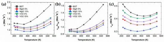 Temperature-dependent (a) total thermal conductivity ; (b) lattice and bipolar thermal conductivity ; (c) electronic thermal conductivity of MgO and VO2 BST composites.
