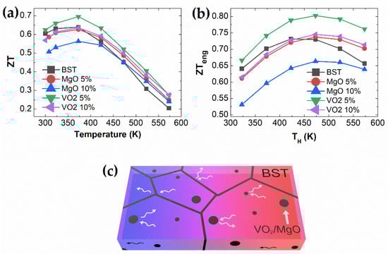 Figure 4a,b depict temperature-dependent ZT and engineering ZTeng of MgO/VO2 BST composites. ZTeng is the dimensionless engineering ZT given by [31]