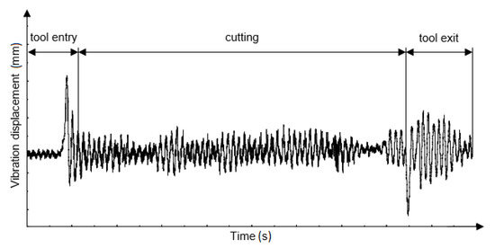 The vibration signal is frequently used as a diagnostic signal and can be successfully used to replace the equally popular measurement of total machining force components. An additional advantage of the vibration signal is that measuring the machining force components usually requires the use of quite expensive force gauges, which are also difficult to install. The vibration signal method offers a good correlation with the force signal as well as the possibility of obtaining other information about the course of the process [19,20]. The measurement of the vibration amplitude or the root mean square value provides valuable information about the course of the process and correlates well with the force signal; however, it is more susceptible to disturbances (due to the sensor location) [1]. Generally, tactile sensors (e.g., accelerometers) or laser sensors (e.g., laser vibrometers) are used typically to carry out vibration measurements. The signals captured by the sensors can be analysed as a function of time or frequency [21]. An example vibration displacement signal waveform in the time domain is shown in Figure 1.