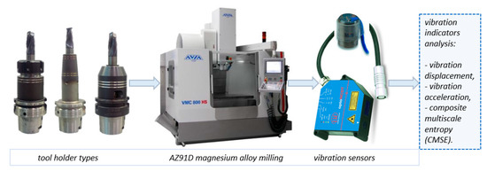 Thus, on the basis of the literature review, some shortcomings could be identified in the analysis of the machinability of light alloys, including magnesium alloys, using vibration signal analysis, and composite multiscale entropy analysis (CMSE). A significant number of publications focused on other light metal group materials—aluminium alloys, and the analysis concerned only one parameter characterising the vibrations, usually the amplitude. This approach is insufficient for a detailed description of the vibrations that occur during the machining process. The number of works attempting to determine the effect of the type of tool mounting on the occurrence of vibrations was also very limited. Additionally, no publication was found regarding CMSE analysis in this regard. This suggested the need to broaden the available knowledge on the stability of the milling process in relation to magnesium alloys. The main aim of the article and research was vibration analysis, taking into consideration basic and additional indicators describing vibrations during machining. Moreover, an additional aim was to analyse the impact of changing technological parameters and the type of tool holder on the selected vibration indicators. In Section 1, a literature review was conducted. Section 2 contained technical details of the measurements and tests performed. The Results and Section 3 presented the main test results and the analysis of the obtained vibration results (the main chapter was divided into subsections: Vibration displacement, Vibration acceleration, Composite multiscale entropy). Section 4 contained the main conclusions in the form of main points.