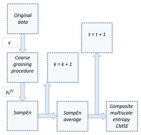 The algorithm for calculating the composite multiscale entropy (CMSE) is presented in the form of the block diagram in Figure 3, where the final result for each scale factor τ is the averaged SampEn depending on k-th loops.