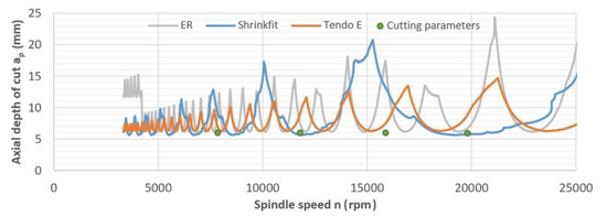 Stability curves for the tool mounted in ER collet chuck, heat shrink chuck, and Tendo E hydraulic chuck (fz = 0.15 mm/tooth).