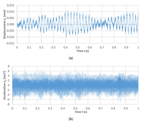 Examples of time series for (a) displacement, (b) acceleration of vibrations recorded during the milling process (vc = 800 m/min, fz = 0.05 mm/tooth, ap = 6 mm).