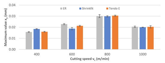 The impact of cutting speed on the vibration displacement was tested over the range vc = 400–1000 m/min. Figure 6 shows the maximum vibration displacement values xy obtained while milling using each of the three tool holders.