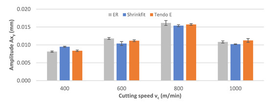 Figure 7 shows the impact of the cutting speed change on the vibration displacement amplitude Axy during the milling process. While milling at a speed of vc = 400 m/min, the lowest amplitude values were recorded for the ER collet chuck and for the heat shrink chuck in the case of other speeds. Throughout the range of cutting speed changes, similar values were obtained for all tool holders, increasing with higher cutting speed values, except for at the highest speed, which was associated with a slight decrease.