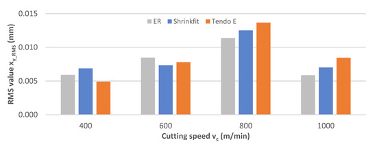 The impact of the cutting speed change on rms displacement values xy_RMS is shown in Figure 8. The cutting speed increase resulted in a gradual value increase up to the speed of vc = 800 m/min, followed by a slight decrease. The achieved rms values were 0.005–0.014 mm, with the lowest values for the hydraulic chuck while machining at a speed of vc = 400 m/min, the heat shrink chuck at vc = 600 m/min, and the ER collet chuck at vc = 800–1000 m/min.