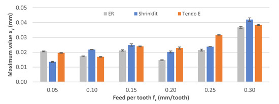 The impact of the feed per tooth on vibration displacement was tested over the range fz = 0.05–0.30 mm/tooth. The obtained maximum vibration displacement values xy are shown in Figure 9.