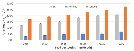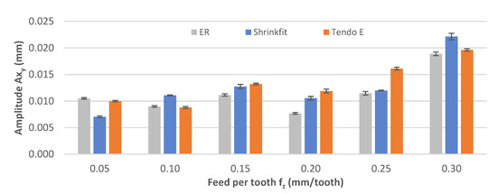 Figure 10 shows the impact of the feed per tooth change on the vibration displacement amplitude Axy. In the course of machining, the recorded amplitude values were 0.007–0.022 mm, with the lowest values recorded mostly for the ER collet chuck at fz = 0.15–0.30 mm/tooth. Increasing the feed per tooth resulted in an initial reduction in the value (fz = 0.10 mm/tooth) followed by an increase in amplitude; however, a decrease also occurred for the tooth feed per tooth value of fz = 0.20 mm/tooth.
