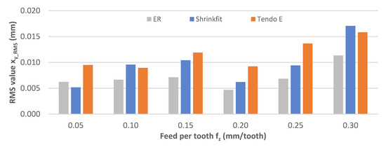 The rms vibration displacement values xy_RMS obtained at a variable feed per tooth are shown in Figure 11. During the machining process, the recorded values were 0.012–0.023 mm, with the lowest feed per tooth of fz = 0.05–0.15 mm/tooth for the heat shrink chuck, fz = 0.20 mm/tooth for the hydraulic chuck, and fz = 0.25–0.30 mm/tooth for the ER collet chuck. Increasing the feed per tooth resulted in a gradual increase in the maximum values, with the exception of fz = 0.20 mm/tooth, which demonstrated a decrease.