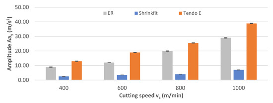Figure 13 shows the impact of the cutting speed change on vibration acceleration amplitudes Aay during the milling process. The change in cutting speed resulted in a pronounced increase in the amplitude, which mainly applied to the ER collet and the hydraulic chucks, with the values of 11.30–26.35 m/s2, while for the heat shrink chuck, the amplitude was 2.30–6.97 m/s2.