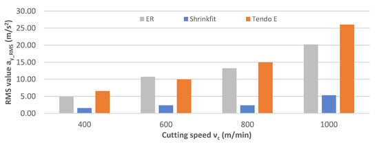 Figure 14 shows the obtained rms vibration acceleration values ay_RMS while milling at a variable cutting speed. While milling with the ER collet and Tendo E hydraulic chucks, the values increased with increases in the cutting speed much faster than in the case with the heat shrink chuck, for which the values were several times lower, at 1.57–5.34 m/s2.