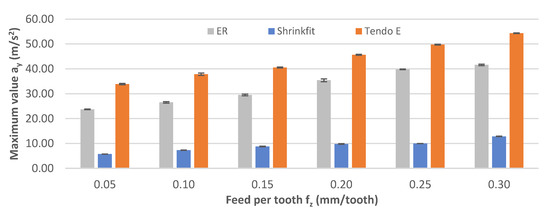 Figure 15 shows the impact of feed per tooth on the maximum vibration acceleration values ay. Similarly to the cutting speed change, a linear value increase was observed as a result of feed per tooth increase. The lowest values of 5.73–54.33 m/s2 were recorded for the heat shrink chuck, while for the other chucks, the values were several times higher at 23.72–41.58 m/s2 for the ER chuck and 33.88–54.33 m/s2 for the Tendo E chuck.