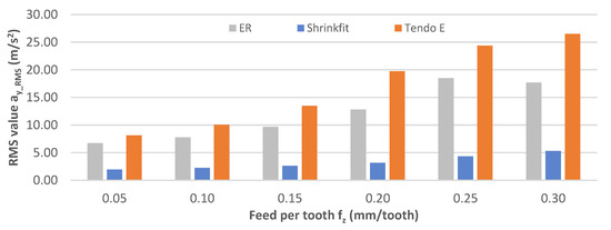 Figure 17 shows the impact of the feed per tooth on the rms vibration acceleration values ay_RMS. Over the entire range of feed per tooth changes, the lowest values were obtained with the use of the heat shrink chuck, at 1.94–5.31 m/s2. While using the hydraulic and the ER chucks, the measured values were several times higher at 6.72–26.50 m/s2, with linear increases as a result of feed per tooth increases.