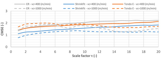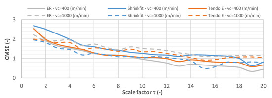 The change in CMSE for vibration displacement signals for milling at cutting speeds of vc = 400 m/min and vc = 1000 m/min is shown in Figure 18.
