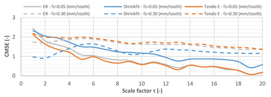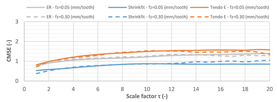 Figure 19 shows the CMSE curve for the vibration displacement signals while milling at a feed rate of fz = 0.05 mm/tooth and fz = 0.30 mm/tooth. Initially, the entropy value increased for all vibration displacement signals, and then it stabilized at a higher scale factor. The signals recorded during the machining showed varied levels of regularity for the respective tool holders and were similar for both cutting speeds; however, the least disordered signal occurred during the machining with the milling cutter mounted in the heat shrink holder.