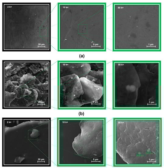 SEM micrographs of the initial GO (a), surface modified UV-rGO flakes (b) and a film surface for PS/UV-rGO@TMSPM composite (c) taken at 2 k×, 10 k× and 50 k× magnifications.