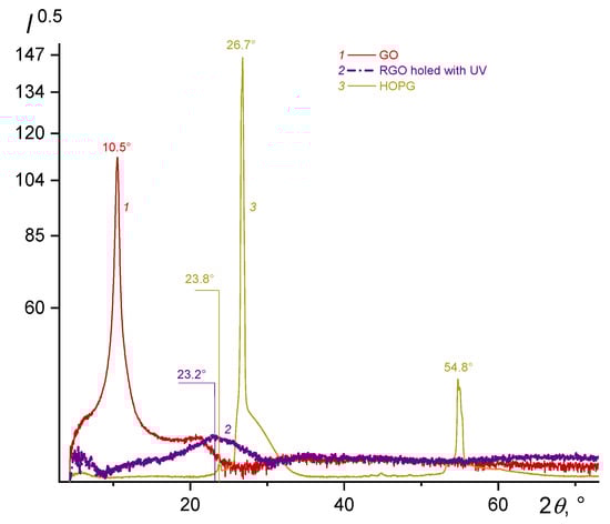 In our case, when studying graphene holed by UV radiation, in the X-ray diffractogram near 2θ at ca. 24°, a wide reflex appears, corresponding to the graphite plane (002) (Figure 2, curve 2). During the reduction process, most of the oxygenated functional groups are removed from the surface of graphene oxide sheets, shortening the distance between the layers. According to Bragg’s law, this circumstance leads to a shift of the reflex to the region of larger angles. It was shown that upon reduction of GO in ultraviolet light, the number of graphene sheets in a stack decreases from 9 to 2 (Table 2). Thus, the UV-rGO flakes are characterized by the absence of galleries consisting of many graphene layers (Figure 2, curve 2). The diffractogram (Figure 2, curve 3) of highly oriented pyrolytic graphite (HOPG) is shown as a reference. The characteristic narrow reflection at 26.7° in the diffractogram indicates many graphene layers in the HOPG galleries. The observed shift to larger angles from 10.5 to 26.7° is due to the closer alignment of graphene planes to each other as compared to graphite oxide (curve 3).
