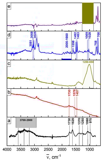 The attachment of an organosilicon modifier to the surface of partially reduced graphene oxide is recorded by the presence of absorption bands in the wavelength range of 1250–850 cm−1 (Figure 4c), which correspond to stretching vibrations of Si–O, Si–OH, Si–O–C and Si–O–Si bonds [19,39]. Since the UV-rGO flakes functionalized with CH2=CH– groups were introduced into PS in small amounts (3 wt.%), their absorption bands are practically invisible against the background of the polymer matrix. In the FTIR spectrum of the PS/UV-rGO@TMSPM composite (Figure 4d), bands were identified that correspond to the vibrations of the C=C bonds of aromatic rings at 1598, 1492 and 1453 cm−1 [40]. The peaks in the range of 2000–1660 cm−1 can be attributed to monosubstituted benzene rings. The rest of the bands belong to the stretching and torsional vibrations of the C–H bonds (3081, 3058, 3025, 1069, 1028, 758, 700 cm−1) [41]. The difference FTIR spectrum of the composite and the PS matrix (Figure 4e) demonstrates only the presence of weak signals in the region of the TMSPM absorption bands [14].