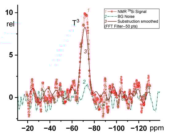 29Si NMR-spectra of UV-rGO modified with TMSPM (1), background noise (2) and (3) subtracted by (2) on (1), smoothed using 50 points by FFT filter in the OriginPro 2021.