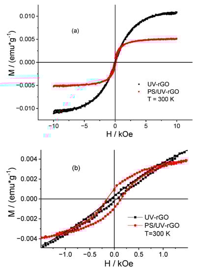 However, in our case, the hysteresis loop is hardly associated with ferromagnetic ordering. Indeed, in a composite based on PS with paramagnetic properties, the hysteresis loop is noticeably more prominent than in UV-rGO (cp. loops in Figure 7b). Within the ferromagnetism model, this means that the ferromagnetism of the composite based on nonmagnetic PS is much greater than the UV-rGO ferromagnetism. The only possible reason for the increase of ferromagnetism in the composite may be due to the appearance of deformation stresses in UV-rGO flakes owing its covalent bonds with PS.