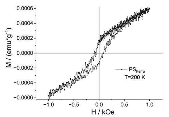 In that case, one can expect that the introduction of a small concentration of magnetic impurities into PS can only slightly increase the size of the hysteresis loop but in no way decrease it. To test this hypothesis, we performed a comparative analysis of magnetization behavior depending on the magnetic field between UV-rGO samples with the largest hysteresis loop of the ferromagnetic type and a composite based on the polystyrene doped with a small concentration of ferromagnetic impurities (PSFerro). Figure 8 shows the field dependence of the static magnetization for the PSFerro at T = 200 K after subtracting the corresponding diamagnetic component.