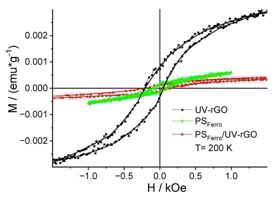 Figure 9 shows the dependences of the magnetic moment of UV-rGO flakes, a composite based on ferromagnetic polystyrene and ferromagnetic polystyrene on the magnetic field at a temperature of 200 K after subtracting the corresponding diamagnetic components. As can be seen from Figure 9, the PSFerro/UV-rGO composite has a hysteresis loop of the same size as PSFerro and much smaller than UV-rGO. Hence, it follows that the introduction of a magnetic impurity into PS suppresses the hysteresis magnetization loop in UV-rGO due to the appearance of an internal magnetic field inside the composite. This effect is observed in type-II superconductors only [47].