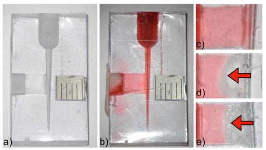 Figure 1. (a) A finger spreader and a matrix band were used to create models representing a root canal with a lateral isthmus. (b) The model was filled with gelatin mixed with red food dye. (c) Irrigation with physiological saline was used as a negative control. (d) When NaOCl was used as an irrigant and activated with am ultrasonically oscillating tip for 30 s, 43.2 ± 8.7% of isthmus surface was cleaned. (e) Adding HEDP to NaOCl did not affect cleaning efficacy (47.9 ± 9.4% cleaned, p > 0.05), as can be appreciated by comparing panels (d) and (e) (arrows).