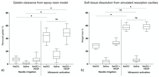 Figure 2. Box plots with error bars indicating maximum and minimum values. (a) Experiment 2: Percentage of removed gelatin after different irrigation protocols (n = 12). Ultrasound activation significantly (p > 0.001) improved cleaning of the simulated isthmus in the epoxy resin model. Adding HEDP to NaOCl did not change the efficacy of cleaning (p > 0.05). (b) Experiment 3: Similar results were obtained with the soft tissue dissolution from simulated resorption cavities in human root canals, with the only difference that mere irrigation with solutions containing NaOCl did dissolve some tissue. Asterisks denote significant differences between data sets at the 5% level, ns = non-significant, p > 0.05.