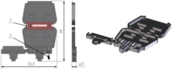 Research model of electrical connector housing, 1–forming insert of flexible hinges, 2–injection point.