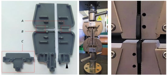 A test sample cut in half and mounted on a testing machine. (A) The hinge located closer to the injection point, (B) the second hinge, (C) separated part of the molding.