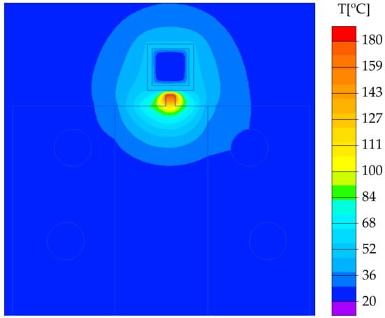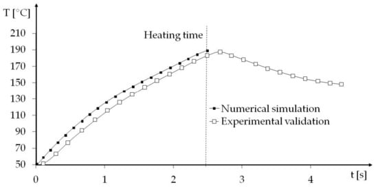 The numerical simulation of induction heating is presented in Figure 3 and Figure 4. The first diagram presents the temperature distribution in the selectively heated hinge region after 2.5 s—the temperature in the hinges’ region is even. The temperature in the center of the hinge was measured in time (Figure 4), and after 2.5 s it reached —that value was set as maximum . In Figure 5, the experimental validation of the simulated phenomenon is shown.