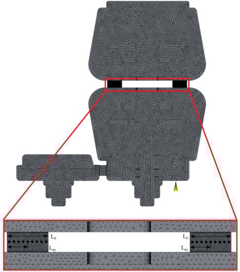 The injection molding simulations were performed with Autodesk Moldflow Insight 2019 (Autodesk, San Rafael, CA, USA) software, which uses a Cross-WLF thermorheological model to describe the behavior of polymer melt during the filling of the cavity (it is the material model that is widely used for injection molding simulations []). The mesh size in the whole part was set to 0.5 mm, whereas the dense mesh was created at the elastic hinges (mesh size of 0.1 mm and the number of layers was increased from 10 to 20) to obtain more accurate results.