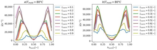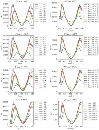 In Figure 7a–j are results of shear rate through the normalized thickness of both hinges. The specific curves present shear rate values at different locations defined by normalized width , where is the distance from the edge of the hinge and is the width of the hinge. The diagrams present the shear rates for different cavity surface temperatures, . When , the diagrams are symmetrical as the for both sides of the hinges are equal. When the temperature is increased via selective induction heating, the asymmetry in shear rate distribution is present. There is a significant difference ( ) in values of shear rate for both hinges—the hinge that is closer to the injection point has a higher shear rate, because of the higher flow rate of the polymer melt in that hinge.
