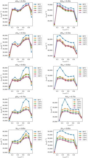 In Figure 8a–j are the results of the maximum shear rate through the normalized length for both hinges. The diagrams present results for different and . The maximum obtained is nonevent through . At the edges of the hinge, the shear rate is smaller because of the closeness to the wall. The differences in in the hinge results from the different local velocity of polymer melt and are equal to 10,000–30,000 . The most significant differences are present for —the increase in the provides more uniform distribution through the . There is also a difference in between hinges equal to 10,000–15,000 .