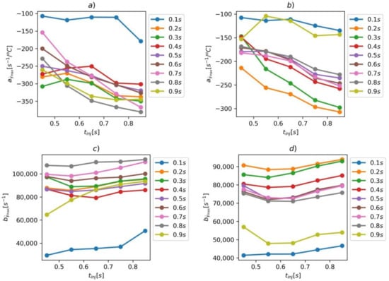 According to obtained results for 90 measurement points (45 per hinge), 86 of fitted lines had a (. The remaining four measurements were removed for further analysis as the numerical error. The shape of the slope and intercept are presented in Figure 9a–d.