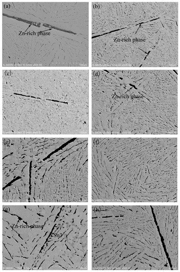 The SEM micrographs of the Sn-9Zn-xY alloys are shown in Figure 2. Figure 2a is the representative microstructure of eutectic Sn-Zn solder, which consists of two phases: The brighter large area is the matrix β-Sn phase, and the deeper coarse rod-like Zn phase is distributed on the Sn matrix. Adding Y to the Sn-9Zn alloy, as shown in Figure 2a–h, led to a significant change in the shape of the Zn-rich phase from the microscopic morphology. The strip shape was smaller than the original and was uniformly distributed in the matrix β-Sn. As the Y content increased, the rod-like Zn-rich phase was further refined. When the doping level was 0.06 wt.%, as shown in Figure 2d, the Zn-rich phase in the alloy system was most uniformly distributed, and the size became finer. Compared with the Zn-rich phase in Sn-9Zn as Figure 2a, the refinement was very significant. However, as the content of Y continued to increase and reached 0.2 wt.%, as shown in Figure 2g, a new phase with a darkness between the Sn matrix and the Zn-rich phase appeared in the alloy, and scattered distribution was observed on the Sn matrix. This compound is YSn3. The binary Sn-Y [28] phase diagram is used to show that YSn3 is unstable at a high temperature and decomposes at 515 °C. The melting point of the rare earth compound is generally high, and trace rare earth elements are present in the molten metal alloy and can be adsorbed on the surface of the grain boundary and prevent the growth of the crystal grains to achieve the effect of refining the tissue. At the same time, the rare earth compound can also reduce the surface activity point and improve the phase interface, uniformity of the surface, fluidity of the molten metal, and compactness of the microstructure.