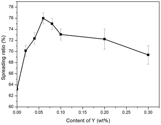 The spreading ratio is shown in Figure 3. As we can observe from curve, the addition of Y had a significant effect on the wettability of Sn-9Zn alloy system. When Y was added to the alloy, the spreading ratio of Sn-9Zn solder increased first and then decreased with the increase of Y content. When the Y content was 0.06 wt.%, the spreading rate reached 76%, and the best wettability was obtained. However, when the amount of Y added continued to increase, the spreading ratio dropped sharply, and the wetting performance deteriorated.