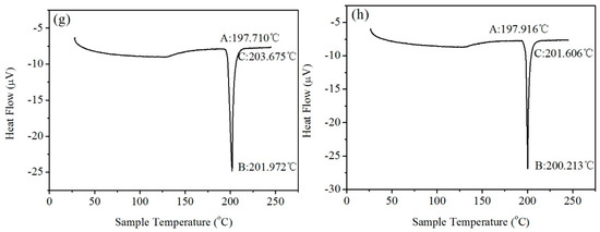 The Differential Scanning Calorimeter (DSC) curves of Sn-9Zn-xY alloys: (a) Sn-9Zn, (b) Sn-9Zn-0.02Y, (c) Sn-9Zn-0.04Y, (d) Sn-9Zn-0.06Y, (e) Sn-9Zn-0.08Y, (f) Sn-9Zn-0.10Y, (g) Sn-9Zn-0.20Y, (h) Sn-9Zn-0.30Y.