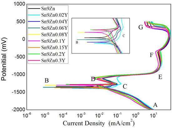 The Sn-9Zn-xY solder alloys was studied by potentiodynamic polarization to determine the effect of varying Y content on the corrosion resistance. Figure 6 shows the electric polarization plots of Sn-9Zn-xY (x = 0, 0.02, 0.04, 0.06, 0.08, 0.10, 0.20, 0.30 wt.%) solders in 3.5 wt.% NaCl solution. The polarization curve in the range of −2000 mV to +500 mV at a scanning speed of 2 mV/s was investigated.