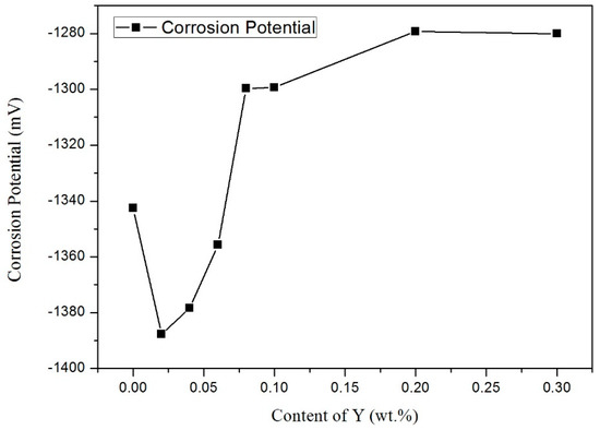 Table 3 shows the electrochemical parameters, including the corrosion potential (Ecorr), corrosion current density (Icorr), and corrosion rate. These parameters were obtained by fitting the polarization curve with Cview software. Figure 7 shows the change trend of the influence of different contents of Y on the self-corrosion potential. As shown in Figure 7 and Table 2, the Ecorr values decreased when the addition of Y content only was 0.02 wt.%. However, with the increase of Y content, Ecorr showed a tendency toward more negative potentials. The Ecorr of Sn-9Zn-0.06Y was close to the Ecorr of Sn-9Zn. With a continued increase in Y content, the Ecorr value increased, reaching a value higher than the Ecorr of Sn-9Zn. Then, value remained stable with the increase of increasing Y content until the Y reached a certain value. However, Icorr value decreased after initially increasing and then leveled off. The greatest influence on the corrosion resistance was the active Zn in Sn-9Zn-xY alloys. Zn was active and easily oxidized when it existed as Zn-rich phase. Y refined the rich Zn phase, homogenized it, and reduced the probability of Zn corrosion on the surface of the sample to improve the corrosion resistance of the alloy. At the same time, Y did not generate the active compound in the alloys. A recent report by Ralston et al. [35] showed that, when testing systems with a certain degree of passivation, the corrosion rate decreases as the grain size decreases. Osório et al. [36] also proved that the corrosion behavior of Sn-Ag solder alloy is closely related to the structure of the array. Therefore, the addition of trace Ti increased the corrosion resistance of Sn-9Zn alloy due to the structural deterioration of the alloy, that is, a large number of primary zinc-rich precipitates were eliminated, and the eutectic structure become more uniform. Liu et al. [26] reported that the addition of Ti led to zinc-rich precipitation phase refinement in the structure, which is conducive to the formation of a more protective passivation film on the surface of the modified composite solder and the enhancement of the corrosion resistance of the material.