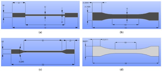 Tensile test specimen geometries and their specifications in mm: (a) ASTM D3039; (b) ISO527-2; (c) ASTM D3039 angle and (d) ISO-modified.