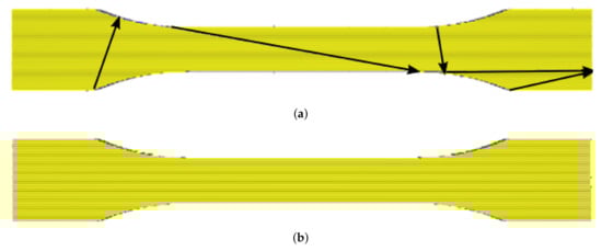 Simulation of production with two travel configuration setups by using arrows visualizing the travel of the nozzle. (a) Default setup with parameters from Table 4, black lines are travel lines, also depositing material, indicating weak points in the specimen. (b) Optimized setup, the travel lines are along the outer surface of the specimen.