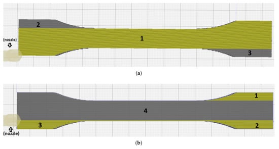 In Figure 3, the yellow areas present the already deposited material, whereas the gray places show yet to-be-deposited sections. In Slicing B (Figure 3b), the 3D printer deposits in the order given by 1, then 2, and 3. When Area 4 is being manufactured, Areas 1 and 2 nearly attain the room temperature such that the bond in the contact lines of the areas between 1 and 4, as well as 2 and 4, may differ from the rest. Observed premature failures in experiments in these possibly weak contact areas are justified by this deficiency in thermal fusion. Hence, we understand that slicer settings may affect the onset of failure in 3D-printed parts as a consequence of heterogeneous properties caused by the printing strategy. Therefore, we have developed Slicing A as follows.
