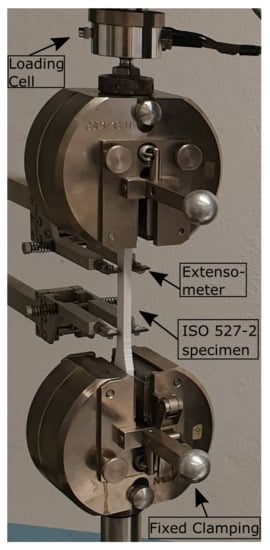 Prior to mechanical tests, all specimens were preserved at a 40 °C vacuum oven against the water uptake. Uniaxial tensile tests were performed with a Zwick 1446 (Zwick, Ulm, Germany). testing machine. A mechanical extensometer was utilized to measure strain. We provide the tensile equipment and the test set-up in Figure 4. Experiments were conducted and steered by displacement with a ramp speed of 2 mm/min on ISO527-2, ASTM D3039, and ASTM D3039 angle specimens; and with a ramp speed of 2.5 mm/min on ISO-modified specimens. In order to study the strain rate sensitivity (viscoelasticity), additional experiments were conducted for a sizeable range of strain rates from 0.01 to 100 s−1. Postprocessing was performed by the corresponding software leading to values of the ultimate tensile strength (UTS) and Young’s modulus. We provide the number of 3D-printed and tested specimens in Table 6 for assessing the reliability. In total, 48 specimens were 3D-printed and tested.