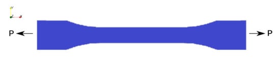 Standard uniaxial testing simulation was performed for different geometries. On one end, , the specimen is clamped along the axis, . This boundary is of Dirichlet type. On the other end, the specimen is pulled by a given force per area, traction , which is a Neumann-type boundary condition applied on . An illustration is depicted in Figure 5.