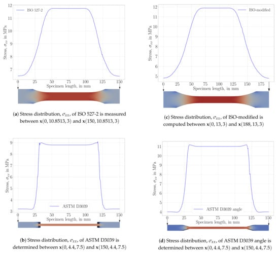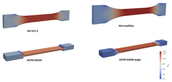 For a comparative study of structure-related effects on stress distribution during a uniaxial tensile test along the x axis, we performed simulations with aforementioned geometries, namely, ISO527-2, modified-ISO, ASTM D3039, and ASTM D3039 angles. Normal stress, , is used for a qualitative analysis. The stress distribution is expected to be constant within the part of the specimen used for assessment. Results are depicted in Figure 6.