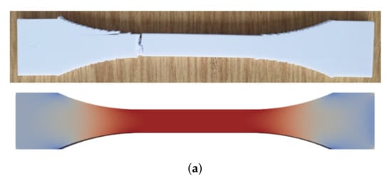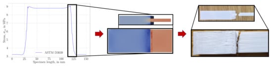 As also mentioned in its corresponding standard [58], ASTM D3039 and ASTM D3039 angle specimens did fail near the tab sections, although this situation was undesired. According to the suggestion in ASTM D3039, more than 40% of failures near the clamping end set the design in question. The design of ASTM D3039 has been realized for fiber-reinforced composites such that the localization of stress is different than herein. We schematically show this situation in Figure 13.