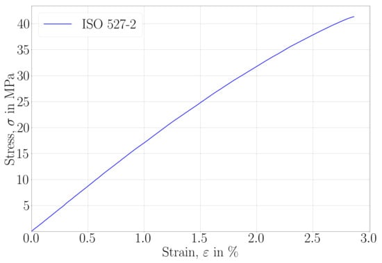In order to remove slack from the specimen and test equipment, preloading is recommended prior to the tensile test. Therefore, we applied up to 0.1 MPa at a low rate (quasistatic condition). Strain was corrected by initially setting it to zero. However, we did not correct the stress results, as the modulus calculation involved stress differences. We determined that the material was elastic without any significant rate-dependency at room temperature. We circumvented from determining Poisson’s ratio and used the manufacturer’s value.